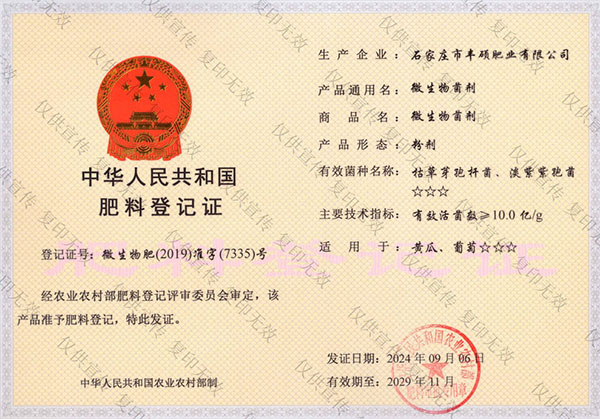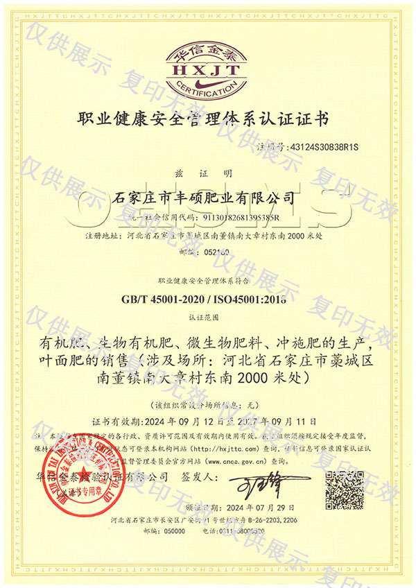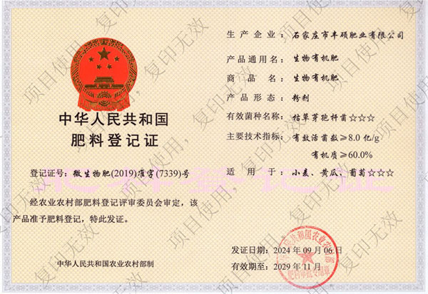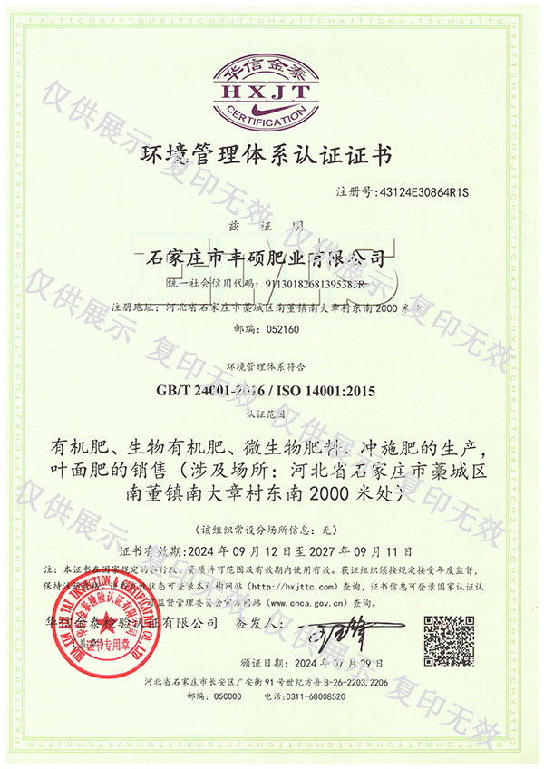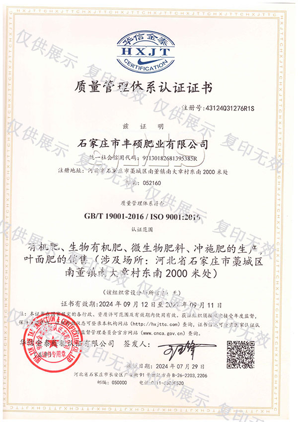 石家莊市豐碩肥業(yè)有限公司是一家集新型肥料的研發(fā)、制造、營銷、服務于一體的高新技術(shù)企業(yè),公司自2008年創(chuàng)辦以來,一直致力于新型肥料的技術(shù)研發(fā)和市場推廣。公司組建了豐碩新型肥料研究中心(院士專家企業(yè)工作站),自主知識產(chǎn)權(quán)研發(fā)團隊專業(yè)科研人員20余人,獲得了多項肥料國家發(fā)明專利。公司目前已擁有發(fā)酵類有機肥、微生物菌劑、生物有機肥、土壤調(diào)理劑、大量元素水溶肥、含腐植酸肥料、含氨基酸肥料、中微量元素肥料等8大品類,“金維克”、“豐碩沃農(nóng)”等2大自有品牌,擁有20多個暢銷品種。目前,我公司已經(jīng)通過了“ISO9001 質(zhì)量管理體系認證”、“ISO14001 環(huán)境管理體系認證”、“OHSAS18001 職業(yè)健康管理體系認證”。...